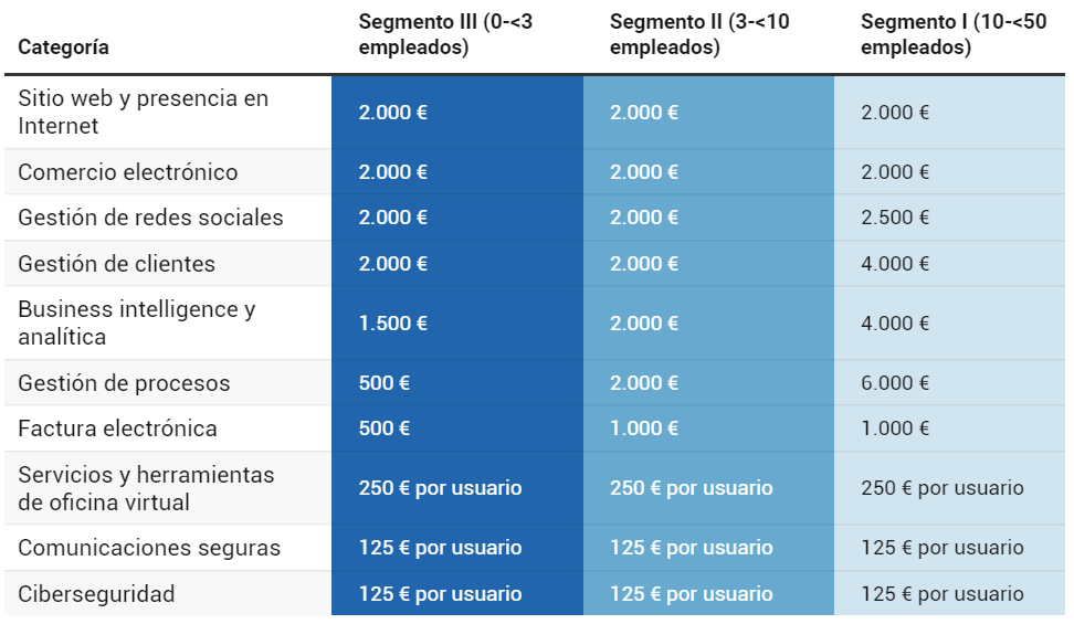 El programa cuenta con un presupuesto de 3.067 millones de euros para el periodo 2021-2023, para facilitar que pymes y  autónomos adopten soluciones de digitalización en diversos ámbitos, como la presencia en Internet, el comercio electrónico, la gestión de redes sociales, la digitalización de las relaciones con los clientes, el business intelligence y analítica, la implantación de la factura electrónica, los servicios y herramientas de oficina virtual, las comunicaciones seguras y la ciberseguridad.